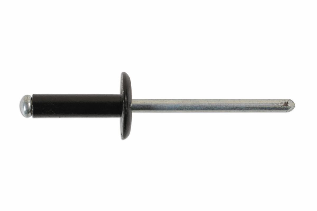 This blind rivet is also called pop nails has a steel served sleeve, and an aluminum dragon. For the right choices of the blind rivet, it is not only important to look at the size, but also to the clemet. This blind rivet has a large head and is anodized black.